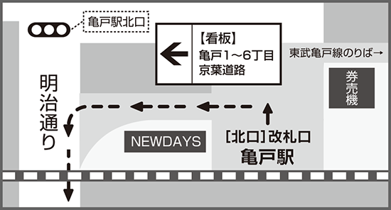 JR亀戸駅北口の改札口を出て左手に進み、高架線下の明治通りを左折してください。